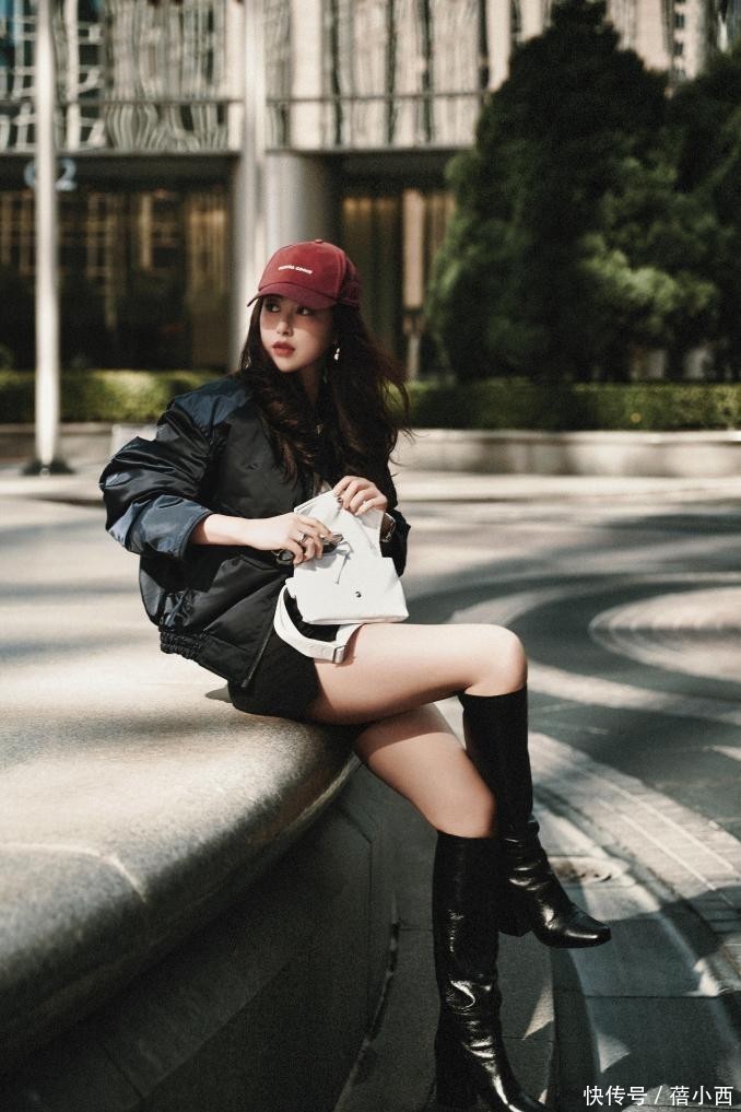 按照大部分人的思维,当外套是薄款、腿上单穿短裤时,脚上基本不会选择长筒靴。因为脚以上的搭配让人觉得温度大概有20多度了,可长筒靴哪怕不加绒,其保暖性也比常规的休闲鞋高出一大截。因此,这身穿搭适合拍写真时穿。